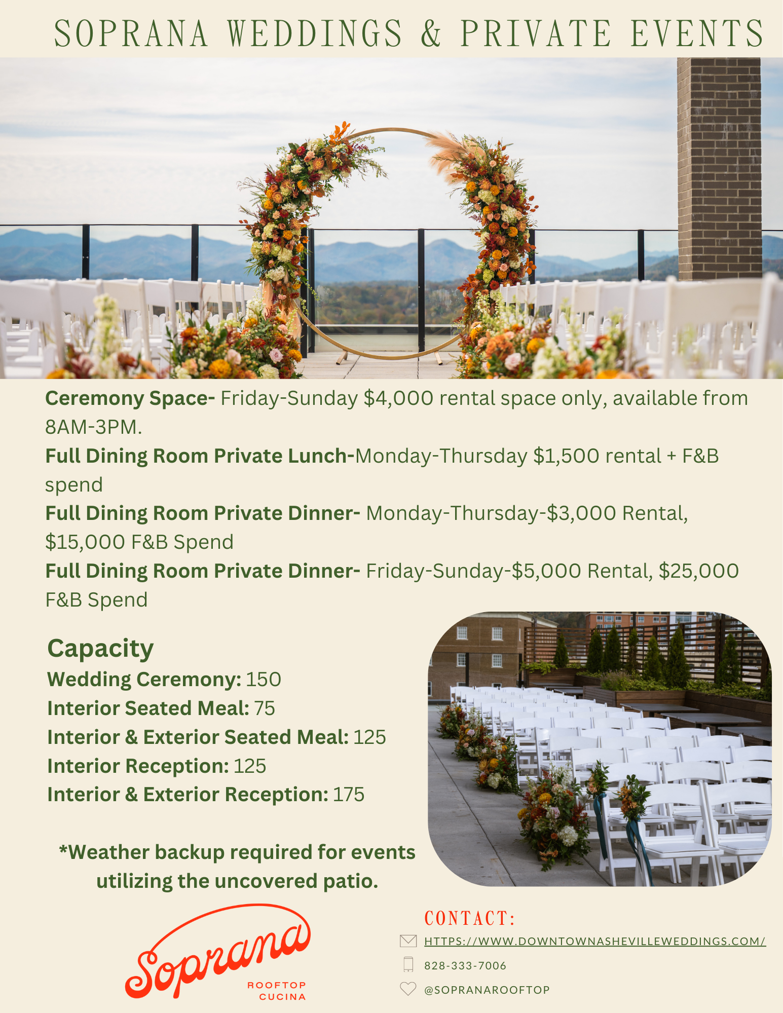 Perched above Asheville with breathtaking mountain views, Soprana is a picture-perfect backdrop for any event.